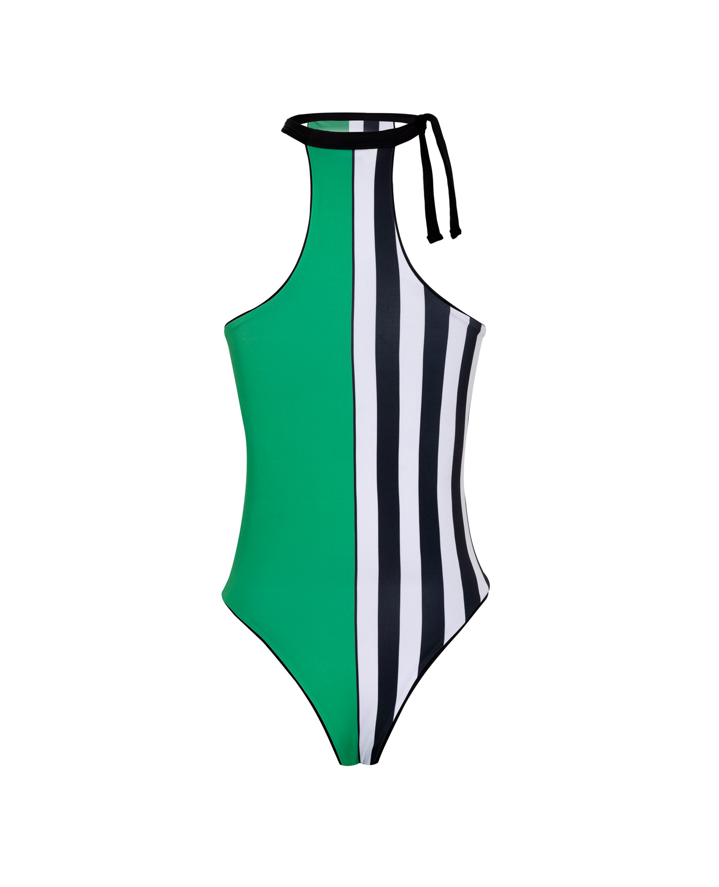 A statement one-piece featuring a modern halter neckline and bold color-blocking in our Botafogo print.